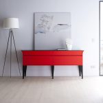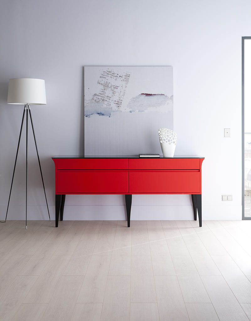 A côté, reprenant les codes – corniche, pieds régence, gorges doucement incurvées – brille une commode dont le rouge écarlate plante le décor de façon presque théâtrale.