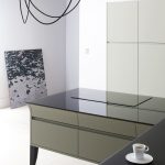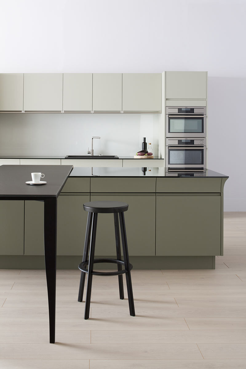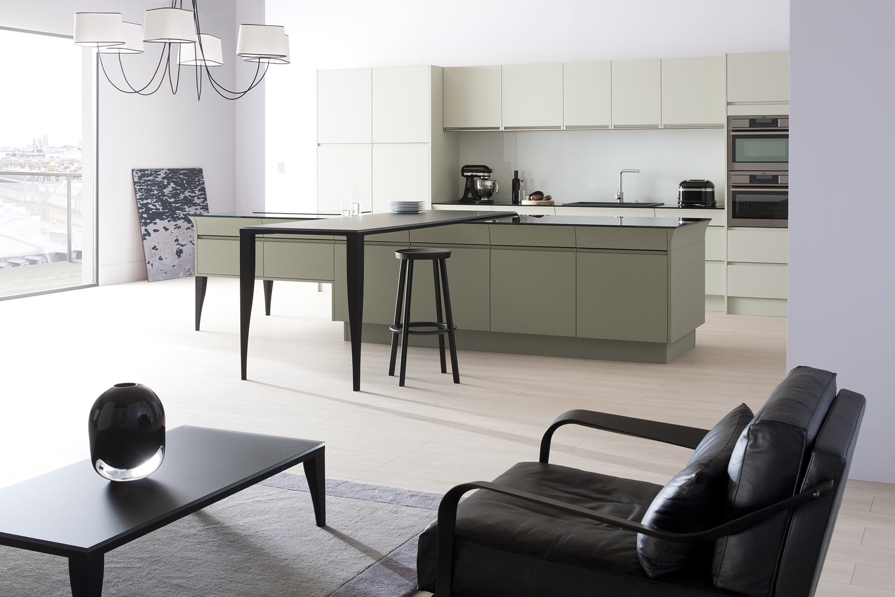 Le modèle Alice dispose d’une très belle laque mate dont le toucher soyeux concrétise l’impression visuelle d’une texture évoquant un beau velours lisse. Devant, le plan de travail verre noir miroir signé Luisina tranche, illuminant de sa brillance le verre acidé noir opaque de la table. La façade sous plan exprime tout son charme, et le pied se détache sous l’îlot en un clin d’œil appuyé à la tradition du meuble français.