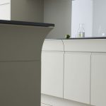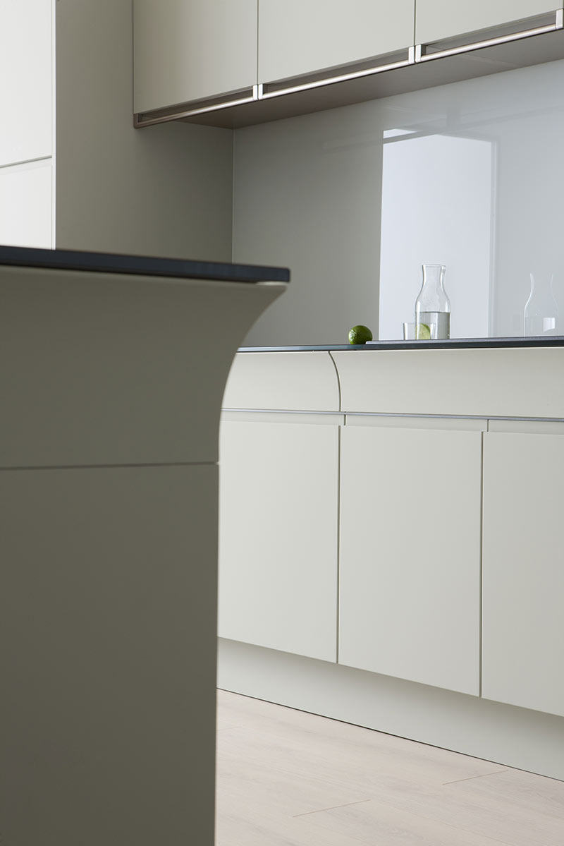 Enveloppant tout le plan de travail de l’ilot d’une virgule épurée, la corniche offre au regard un très beau contrepoint visuel aux pieds tout en apportant au modèle un fini véritablement « couture ». De par son inclinaison, elle permet d’accueillir un plan de travail de belles dimensions.