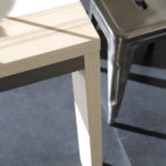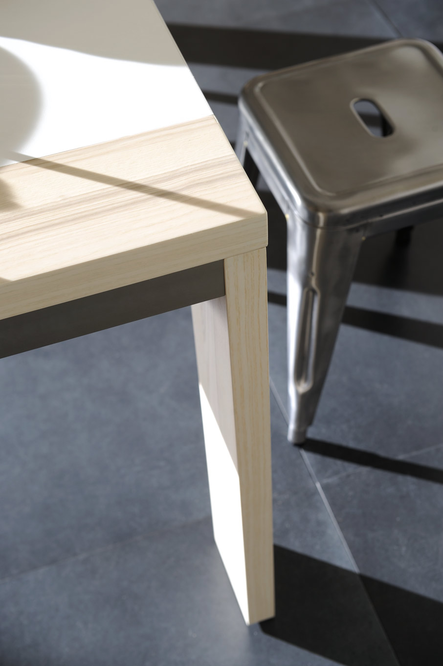 Le choix du bois s’est porté sur un frêne lumineux, avec son veinage léger et vivant, moins prévisible que le chêne plus classique.Solide et rassurante, c’est une essence de bois à forte personnalité qui par son irrégularité devient porteuse d’émotion.