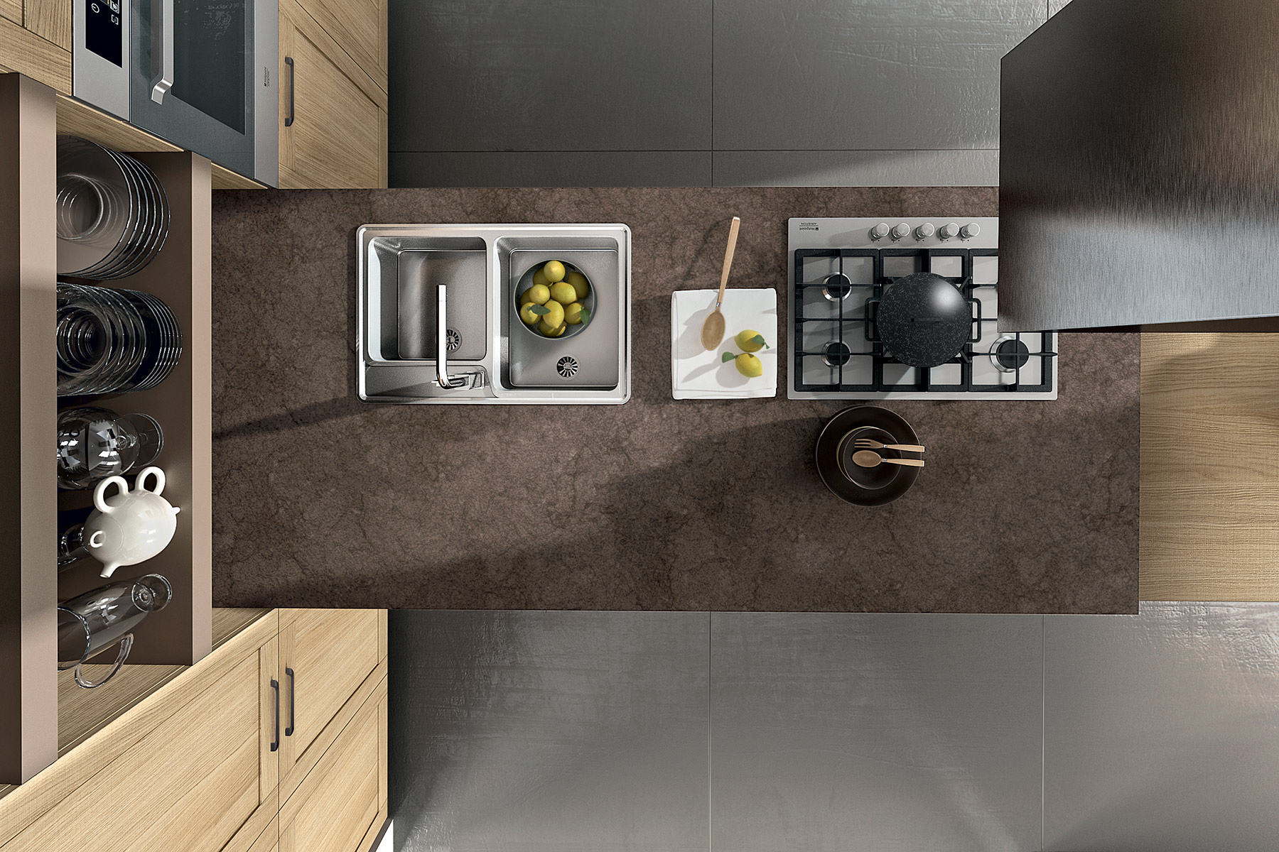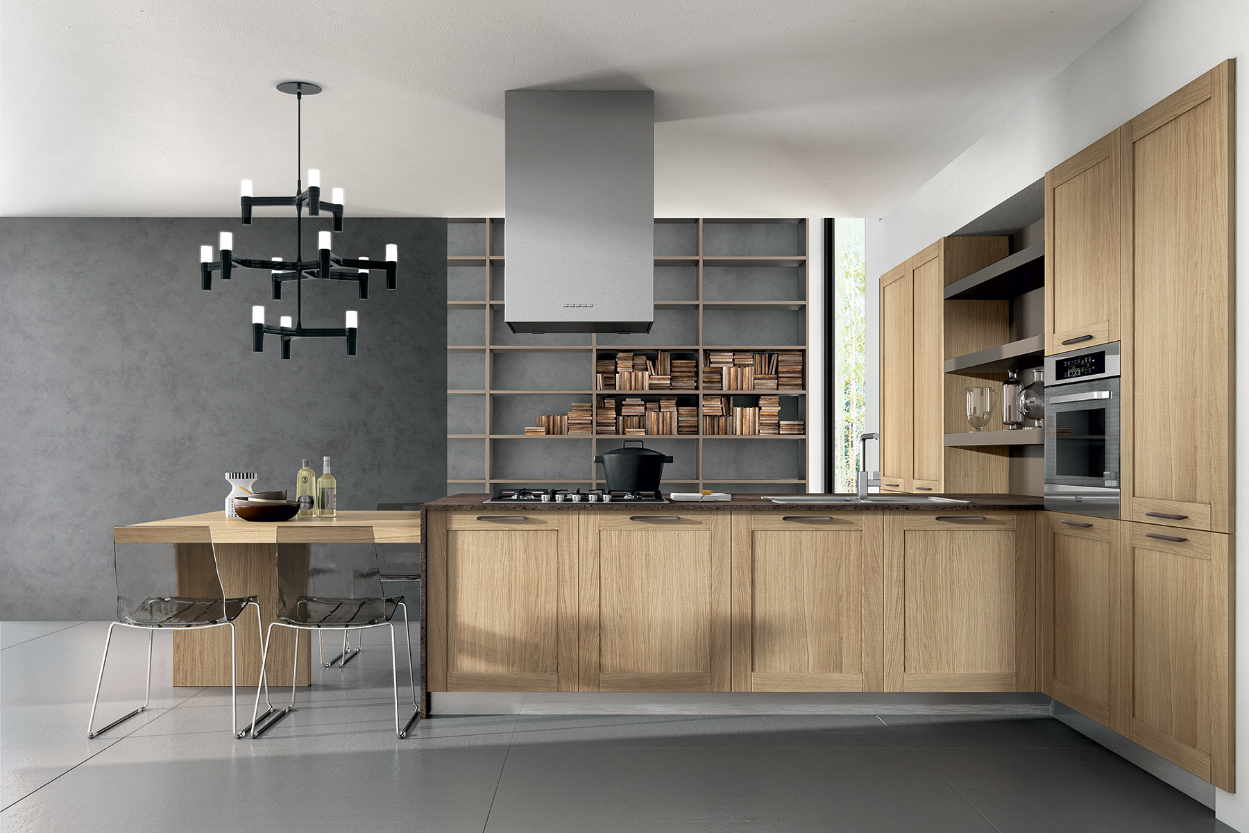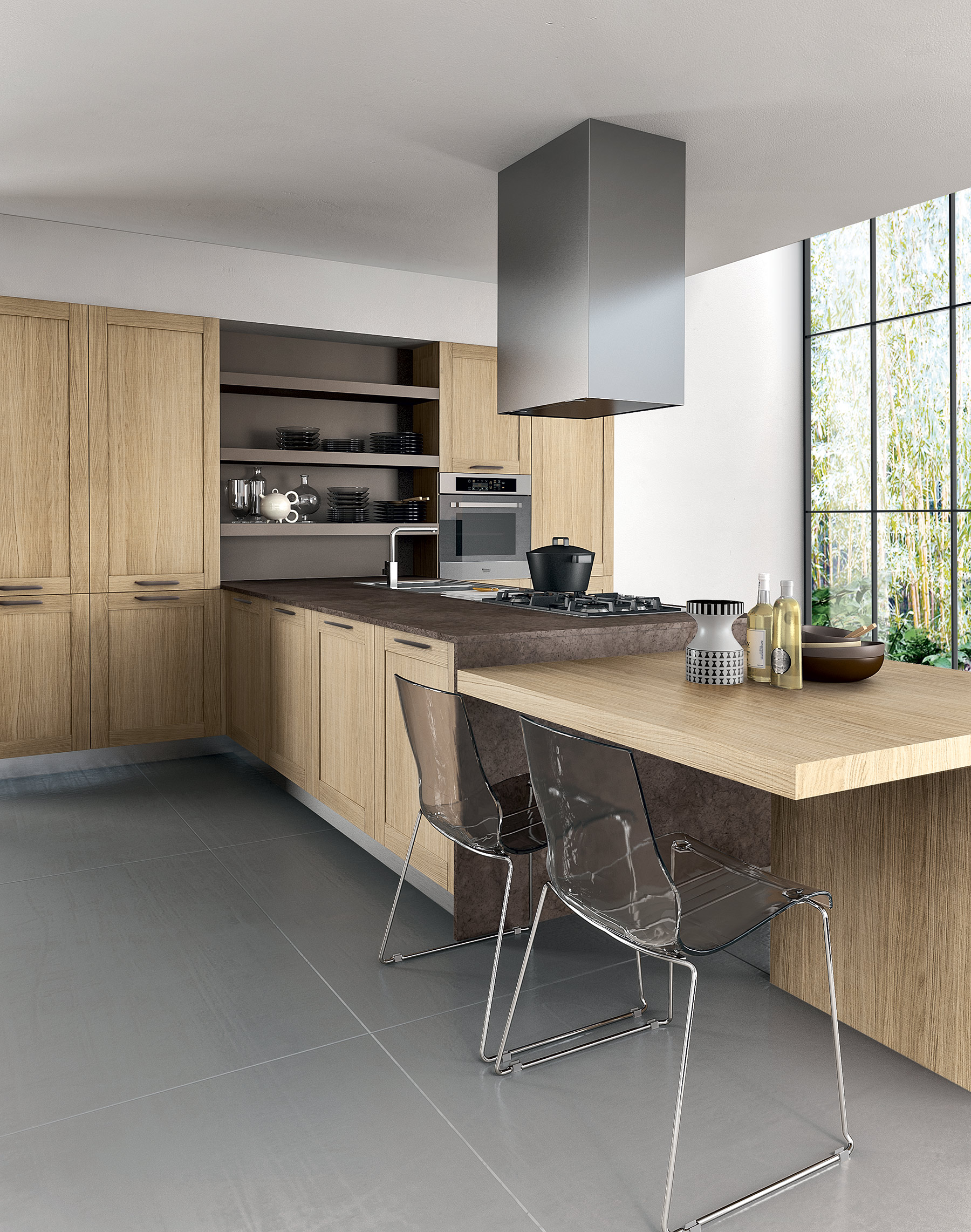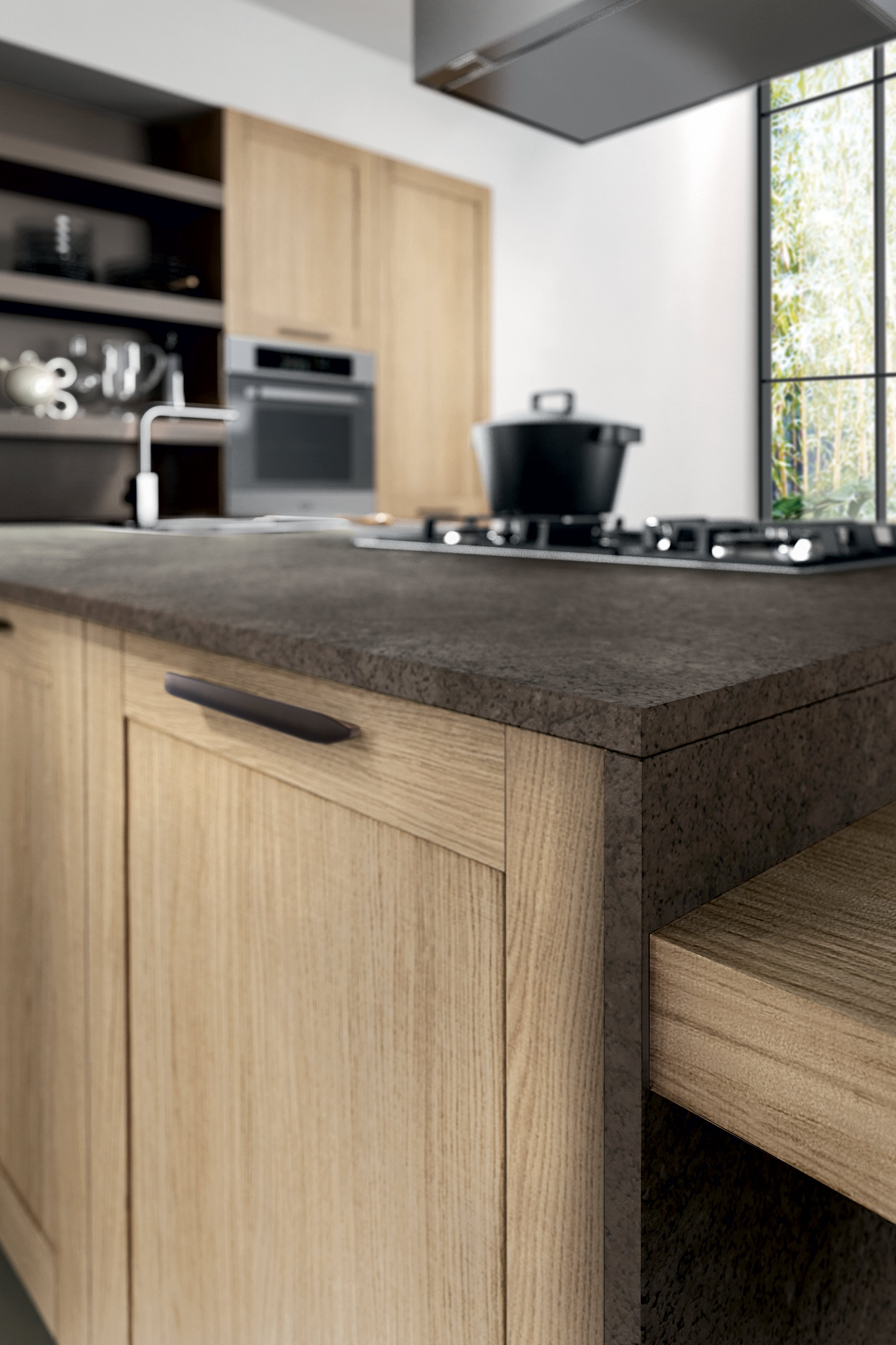 Un dialogue continu et interrompu entre le goût classique et l’actualité. La cuisine Diadema est caractérisée par des portes châssis chêne rouvre massif disponibles non seulement en chêne rouvre tranché Naturale mais également dans la version laquée, en parvenant ainsi à insérer des notes contemporaines dans une atmosphère accueillante.
