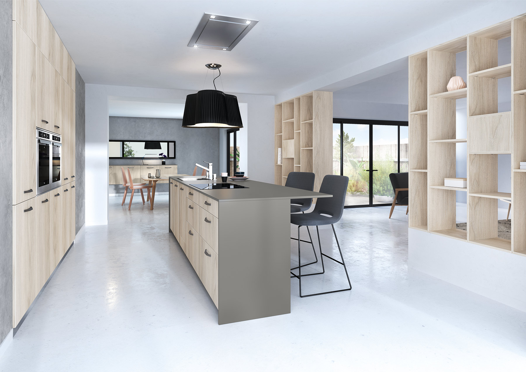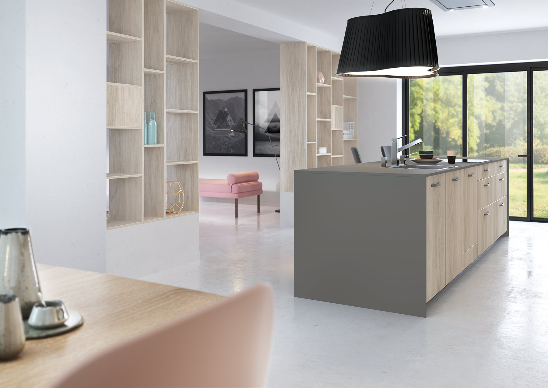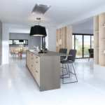 Aménagée dans un écrin de douceur, la cuisine Egérie fait la part belle au style nordique avec ses lignes graphiques et épurées et ses matériaux aux teintes naturelles raffinées. Les façades de l’îlot Gris velouté et le plan de travail en stratifié Fénix® extra-mat s’opposent avec chic au mélaminé structuré décor frêne des armoires.