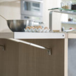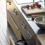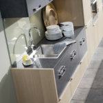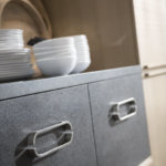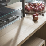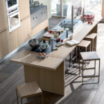 La cuisine Métisse propose des façades inférieures, ainsi que des armoires en chêne. Les plans de travail et parties hautes sont en stratifié, dans un décor à connotation très minérale.
