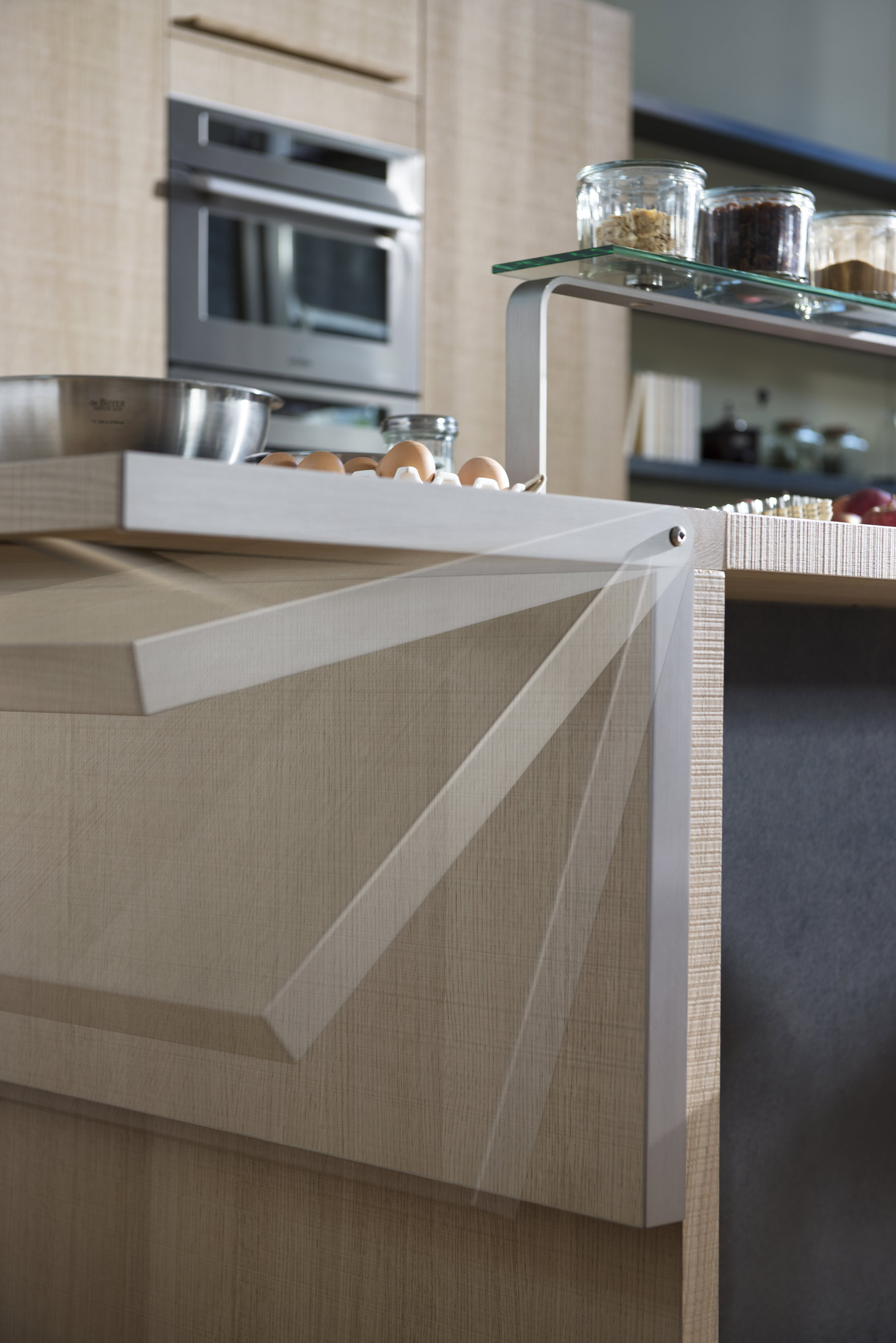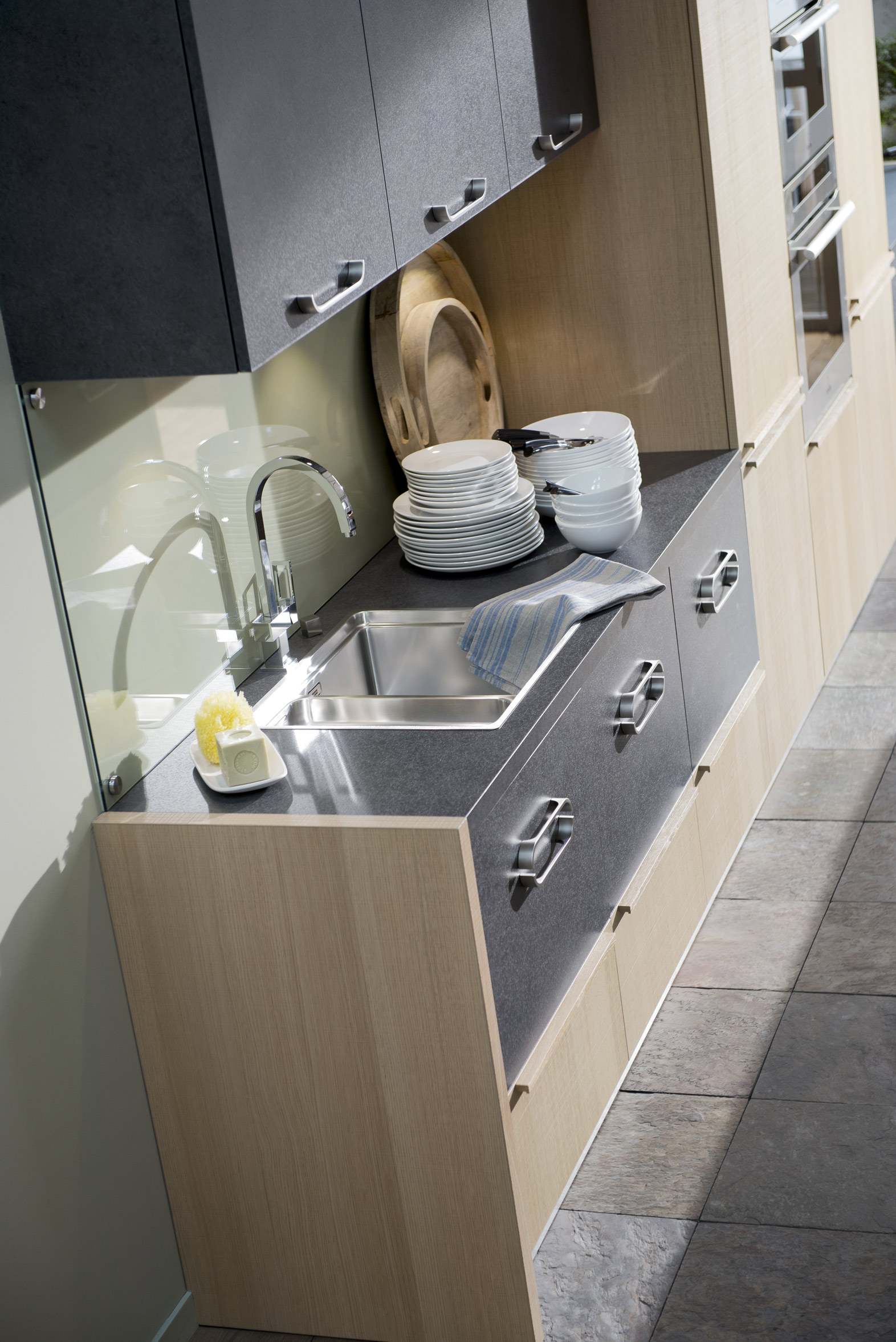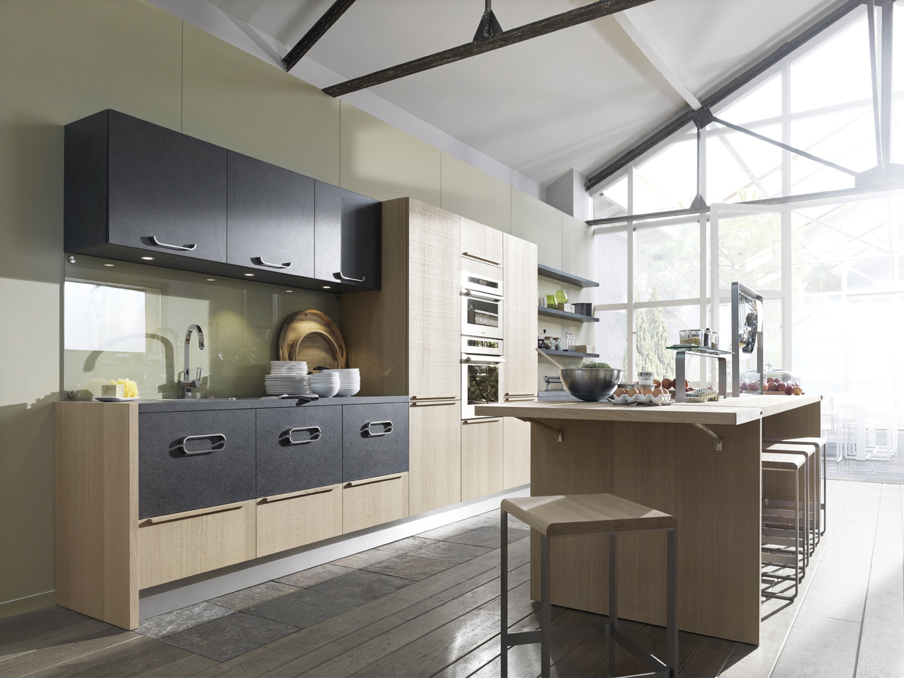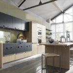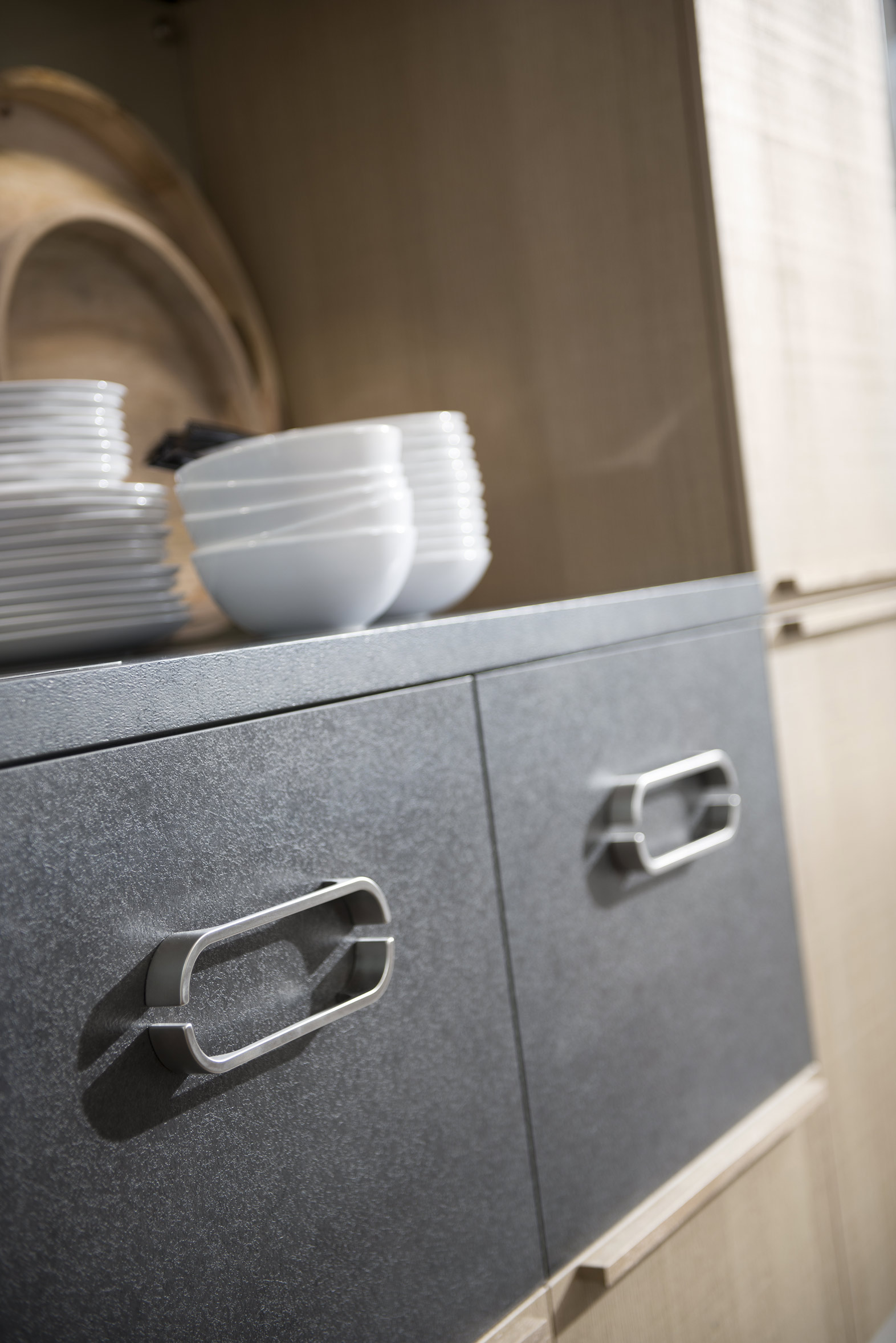 La cuisine Métisse propose des façades inférieures, ainsi que des armoires en chêne. Les plans de travail et parties hautes sont en stratifié, dans un décor à connotation très minérale.
