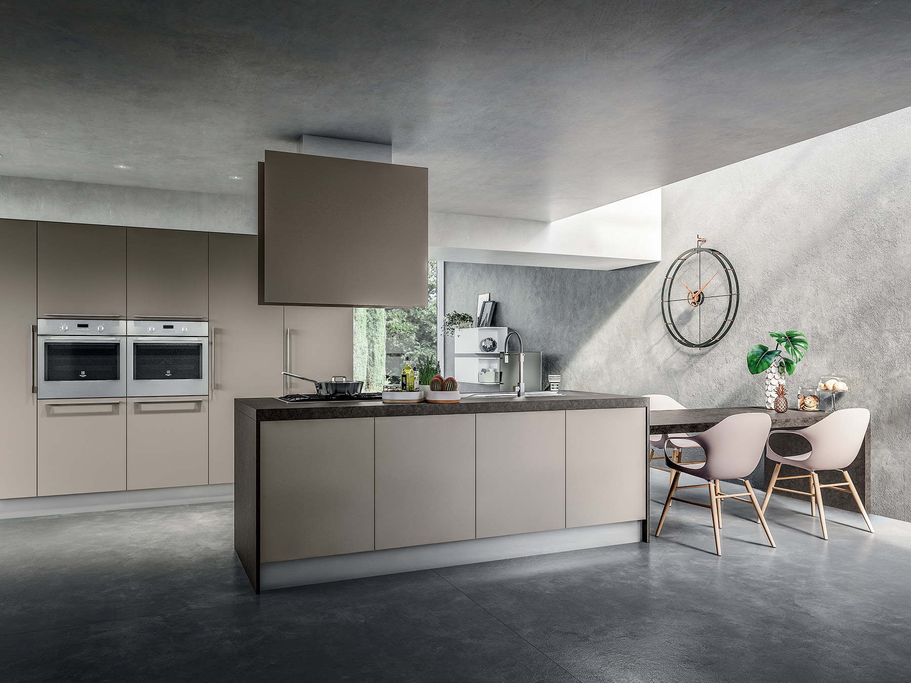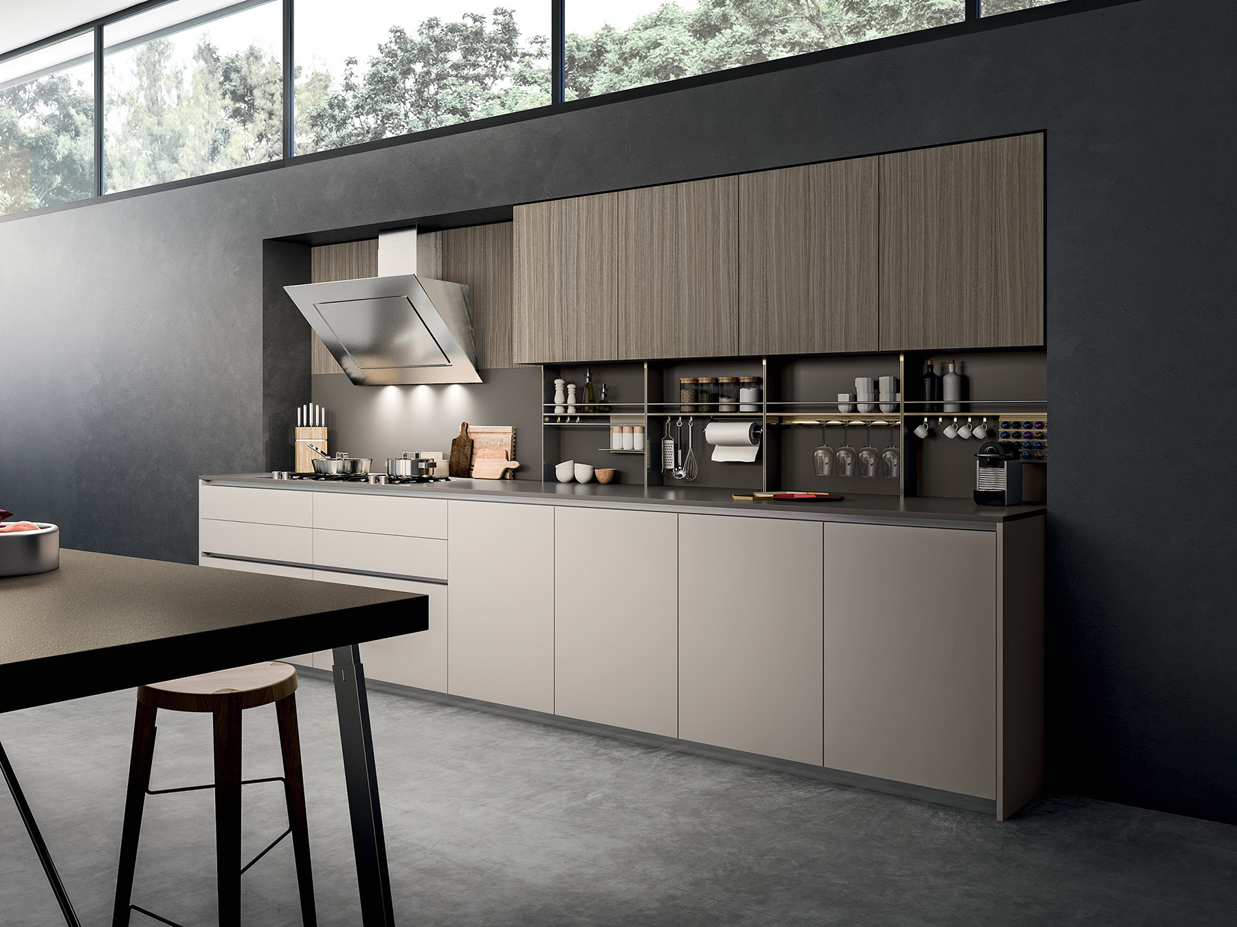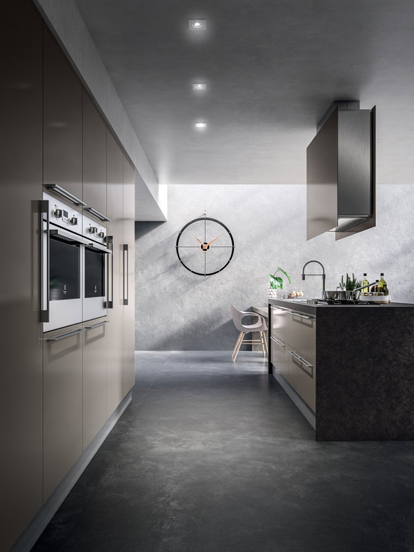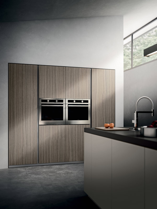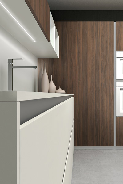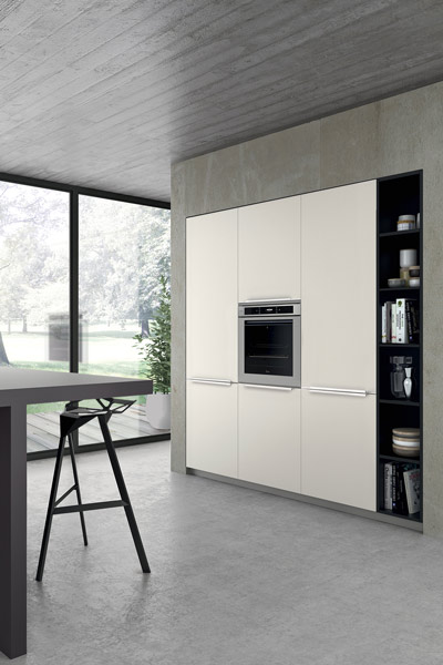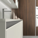 Modèle avec porte d’une épaisseur de 22 mm qui introduit des matériaux innovants adaptés à l‘utilisation dans l’ambiance cuisine comme le mélaminé thermostructuré et le Maxximatt/Maxxigloss verni brillant et mat de production italienne. Une alternative moderne au bois plaqué ou au laqué pour permettre à tous d’avoir une cuisine raffinée et contemporaine sans négliger la qualité et la résistance à l’usure.