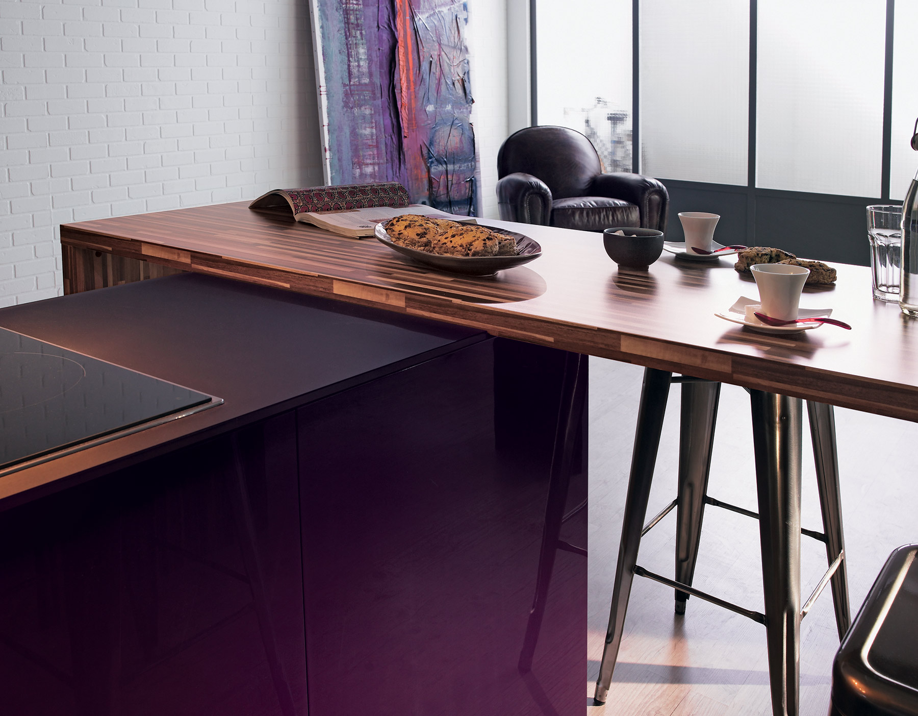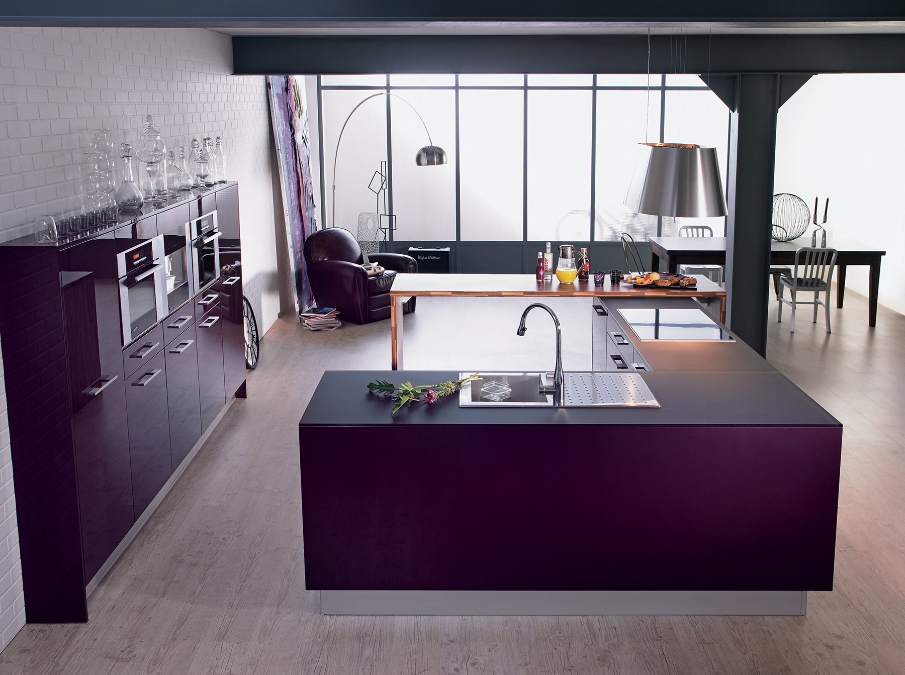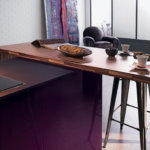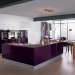 L’implantation de la cuisine Rive Droite adopte une géométrie lisible. Très tendance, Rive Droite s’exprime pleinement qu’ils s’agissent de grandes ou moyennes surfaces. Composée de deux blocs fonctionnels, la cuisine Rive Droite épouse littéralement l’espace : belle série d’armoires de rangement en partie murale, et en îlot, une zone lavage bien distincte de la zone cuisson. L’association des matières verre, laque, inox, stratifié et le choix de la couleur élixir, rappelant le velouté d’une aubergine mûre à point, confèrent à ce modèle son cachet moderniste.