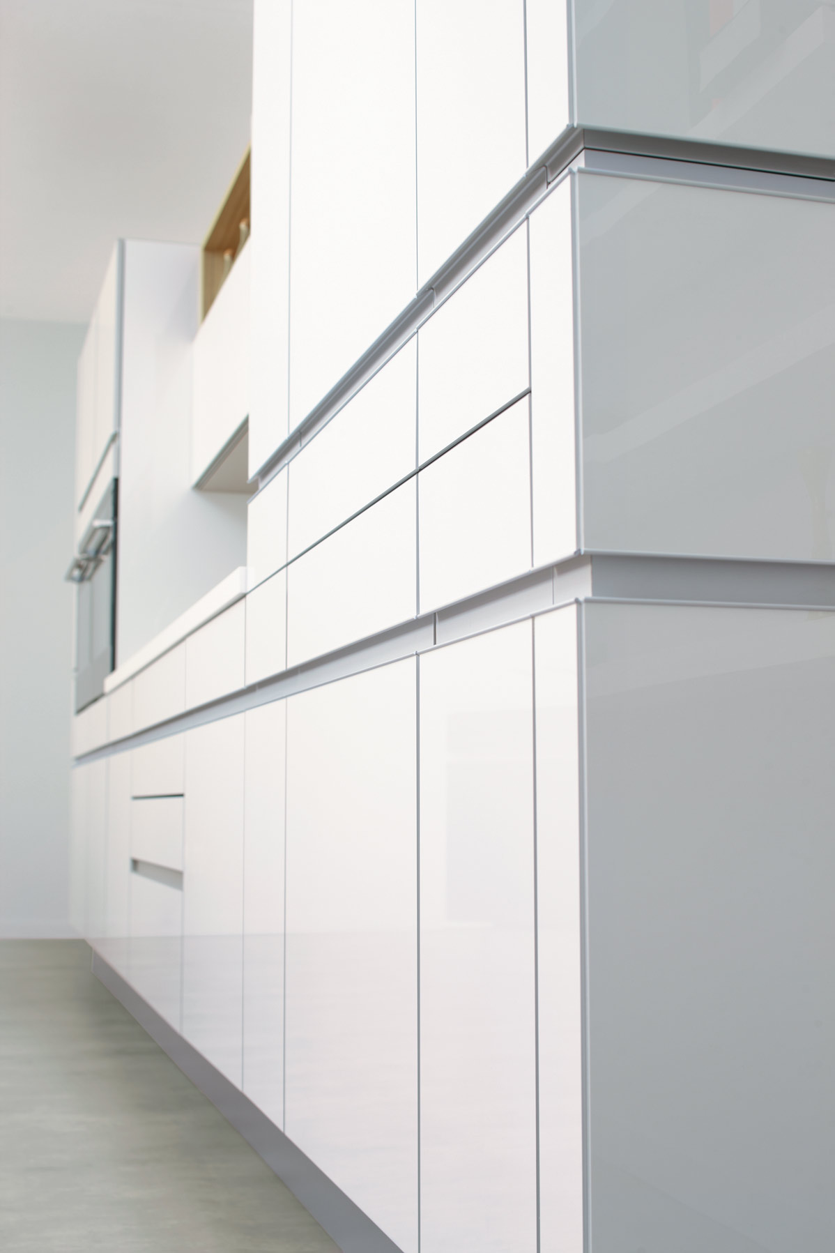 Ce modèle s'adresse aux cinq sens, tout particulièrement à la vue et à l'ouïe. La crédence en aluminium intègre un système innovant d'éclairage tandis que le plan de travail propose un système de sonorisation inédit.