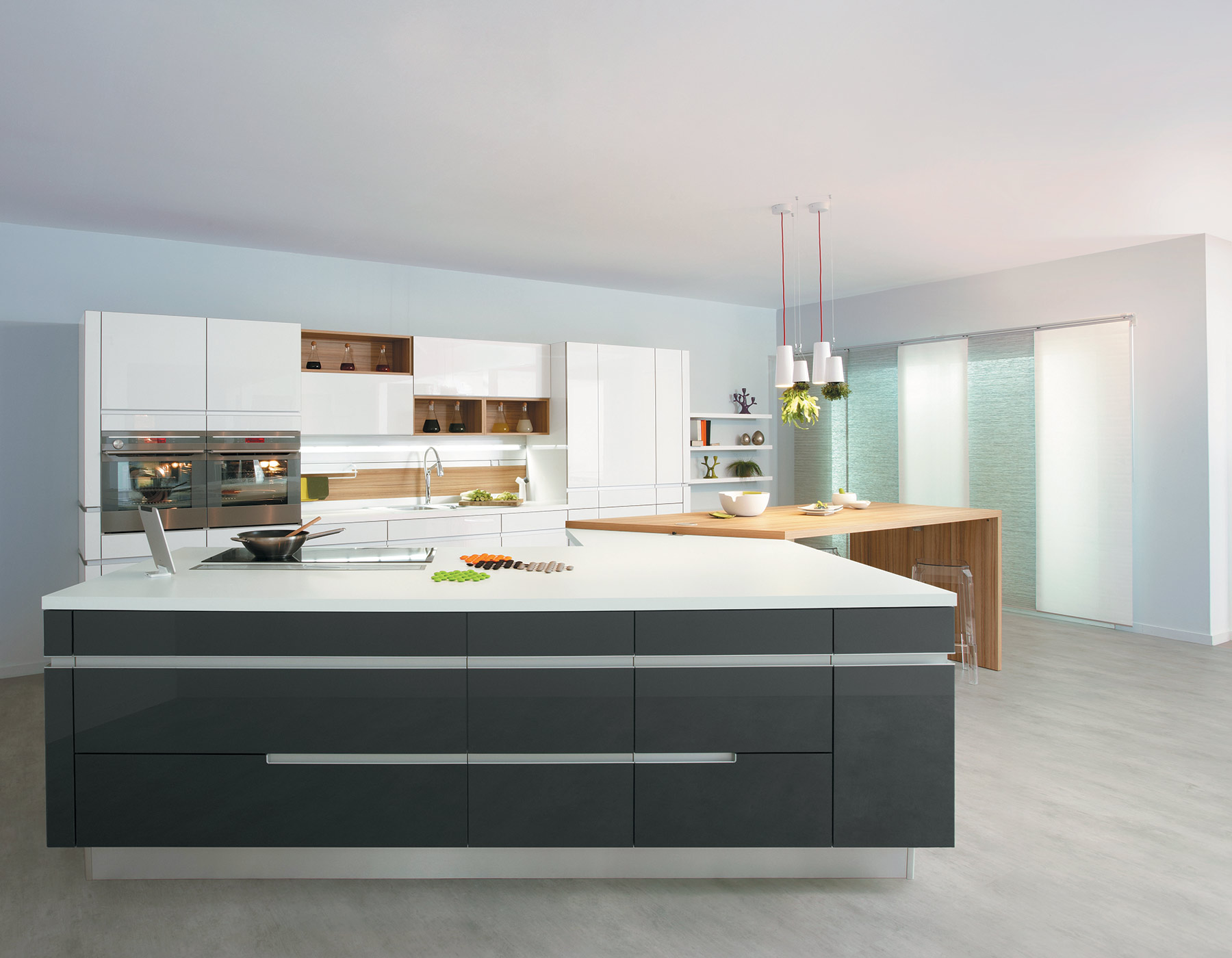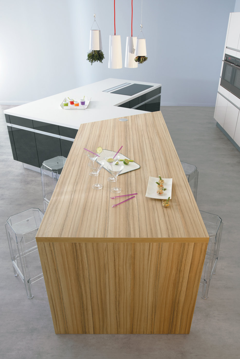 Grâce à un système de sonorisation inédit, le plan de travail de cette cuisine avec îlot central se transforme en gigantesque enceinte intégrée à la cuisine, afin de se connecter à Internet ou de regarder une vidéo.