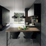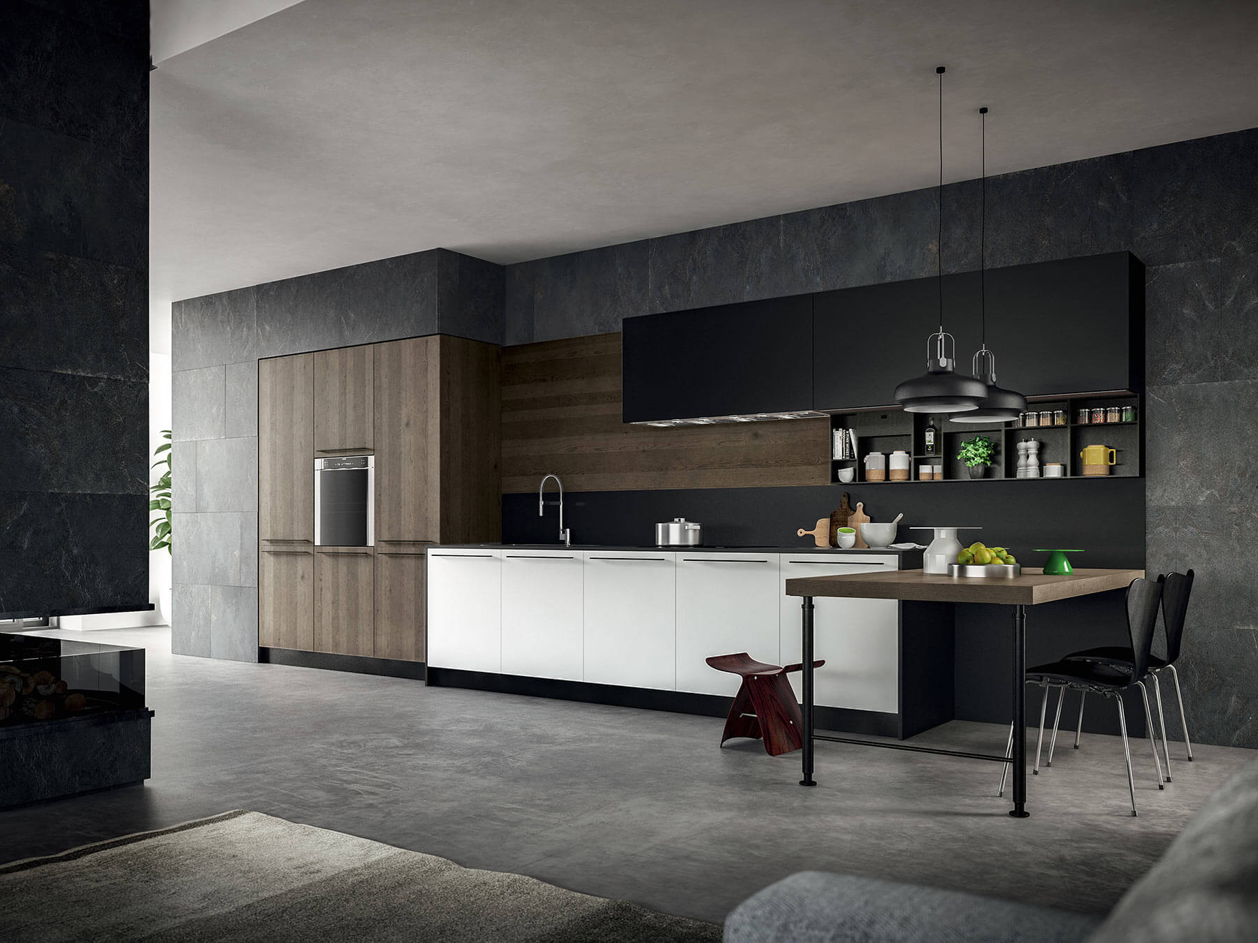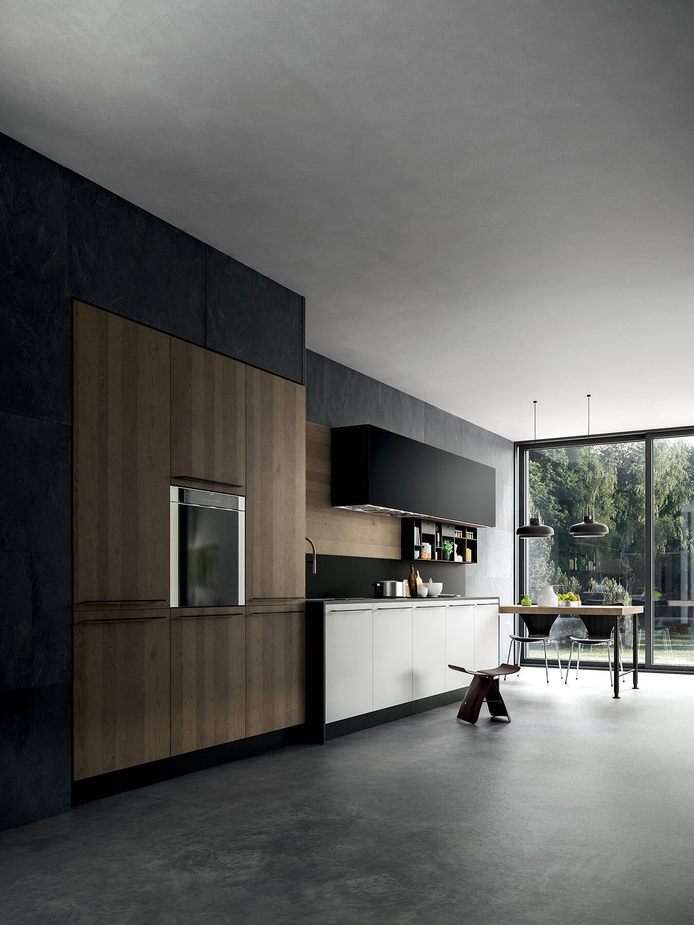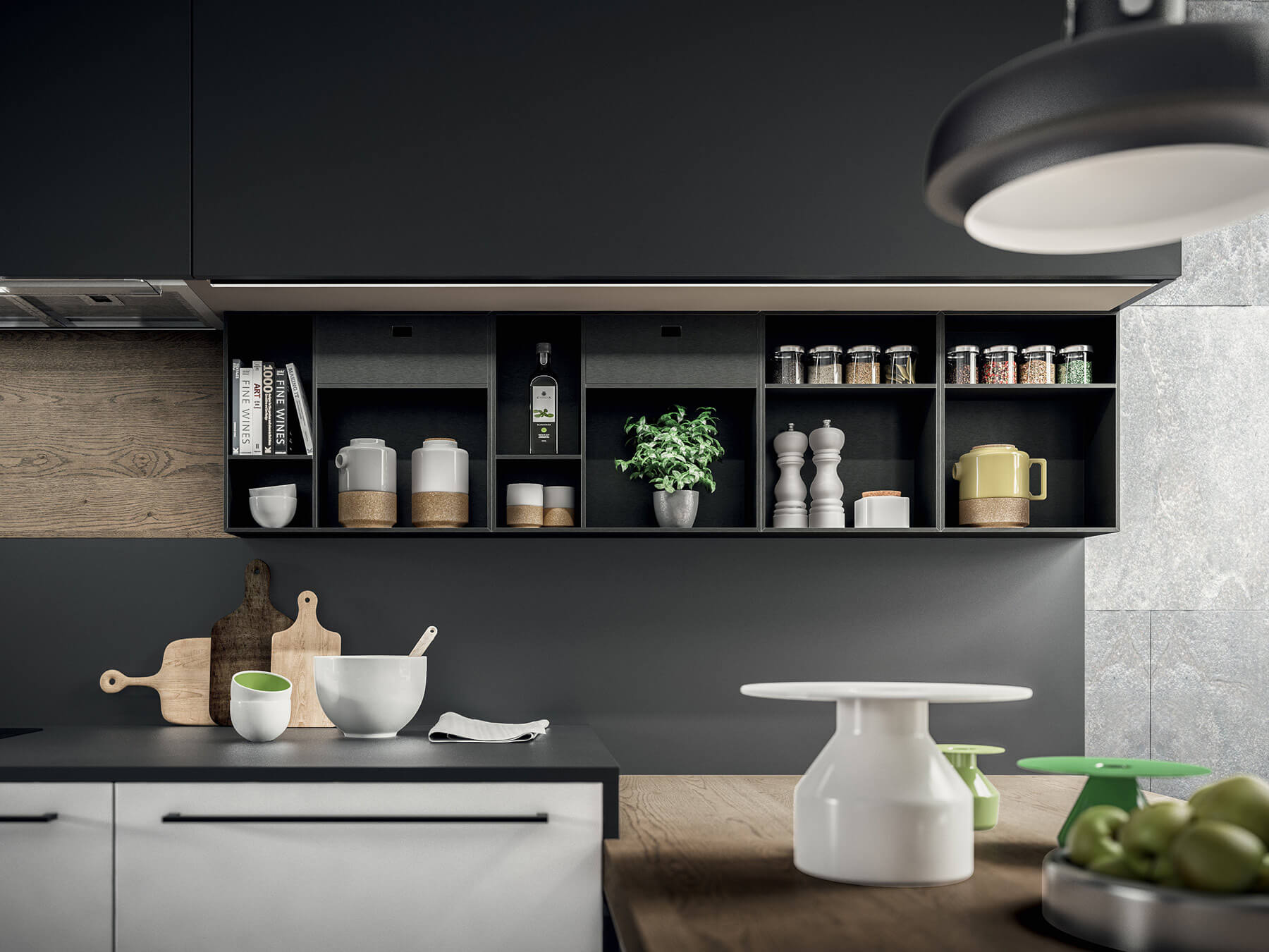 Riche porte d’une épaisseur de 22 millimètres qui confère une importance particulière à la cuisine et aux matériaux qui y sont utilisés, comme le large choix de bois plaqués finement travaillés et les laqués brillants, mats et Vintage. La grande variété de composition satisfait les modes les plus variés de vivre la cuisine et la personnalisation des portes avec des méthodes d’ouverture au design recherché – comme la poignée Zeta ou Lambda – permettent de caractériser l’ambiance cuisine selon la personnalité de chacun.