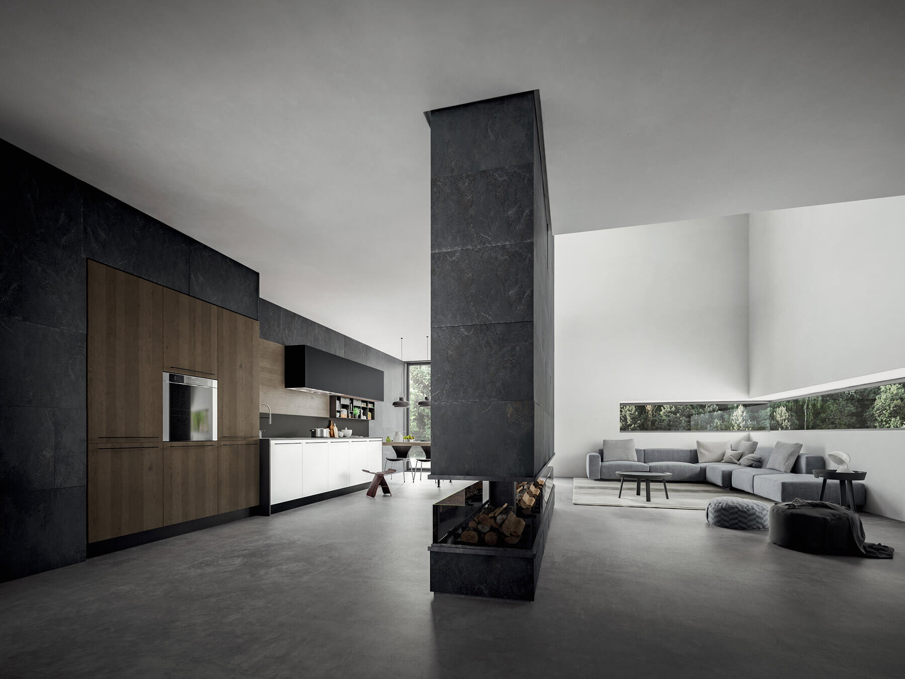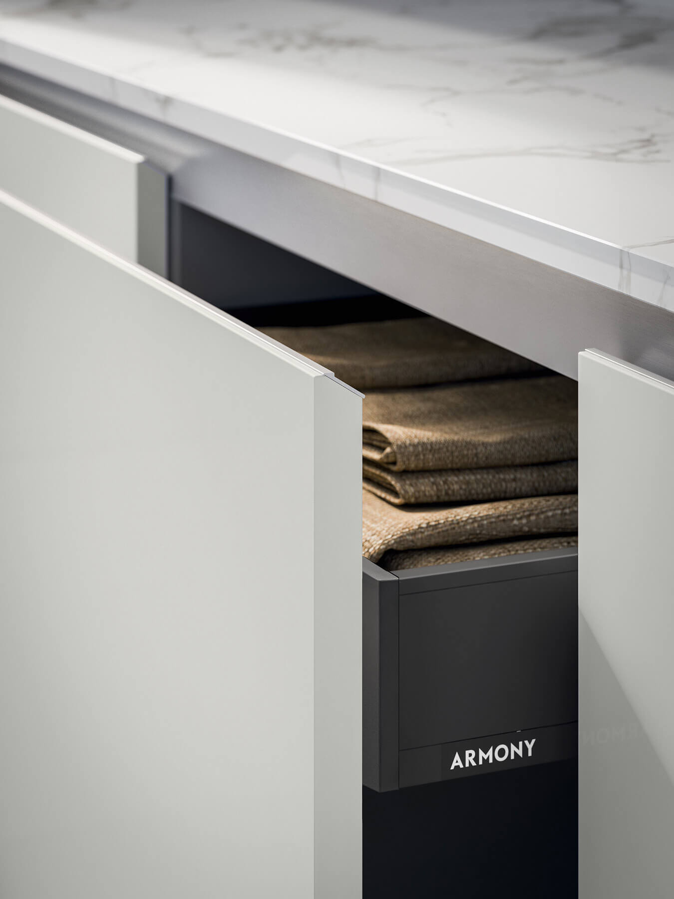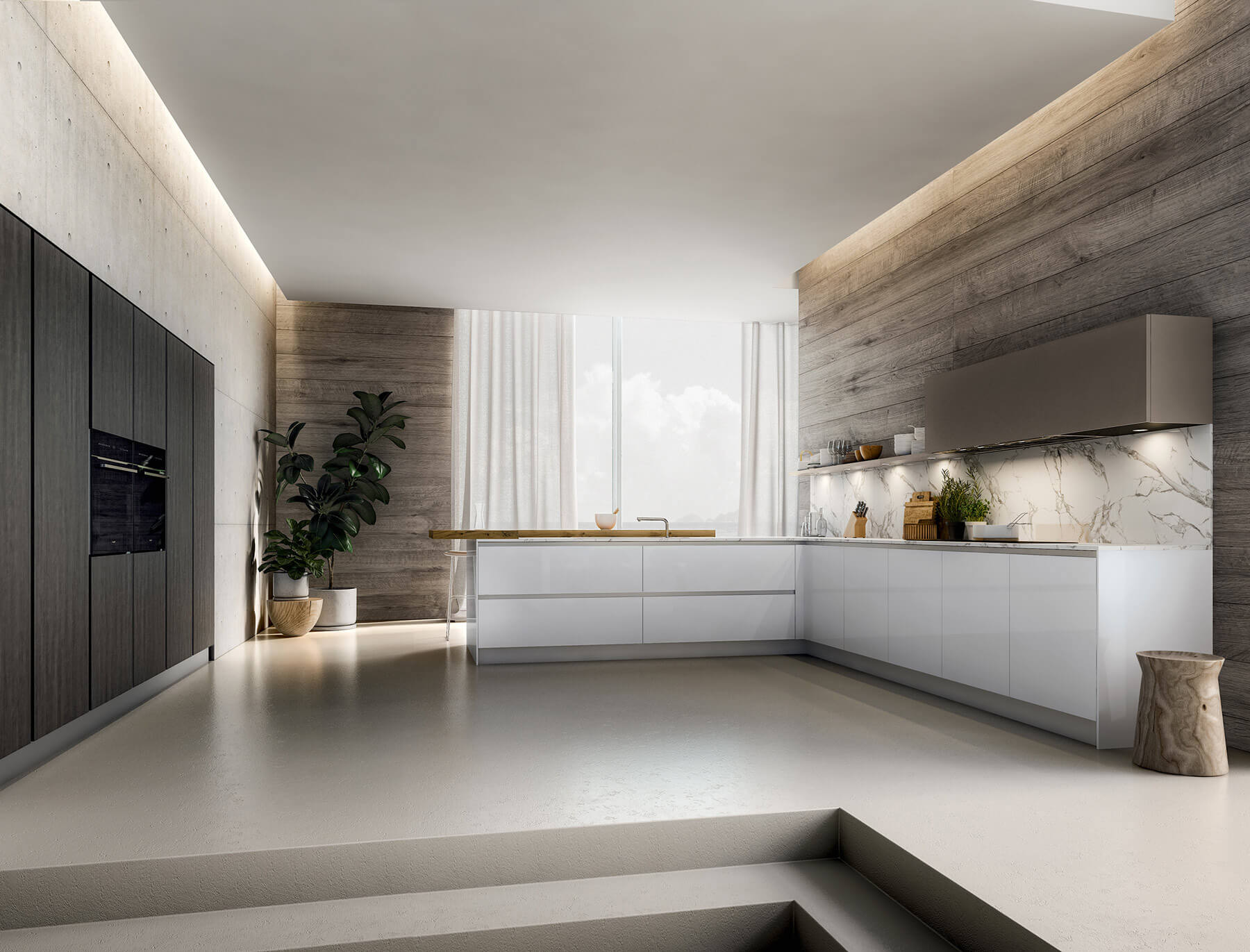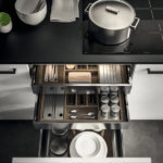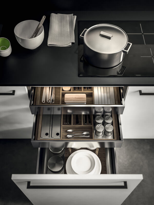Riche porte d’une épaisseur de 22 millimètres qui confère une importance particulière à la cuisine et aux matériaux qui y sont utilisés, comme le large choix de bois plaqués finement travaillés et les laqués brillants, mats et Vintage. La grande variété de composition satisfait les modes les plus variés de vivre la cuisine et la personnalisation des portes avec des méthodes d’ouverture au design recherché – comme la poignée Zeta ou Lambda – permettent de caractériser l’ambiance cuisine selon la personnalité de chacun.